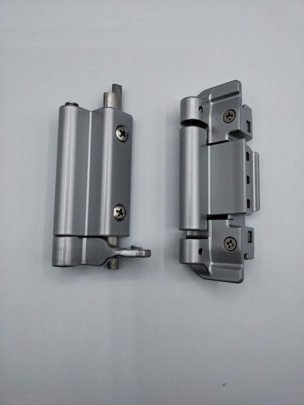 - Dobradiça superior: parte fixada ao caixilho de alumínio extrudido, contraplaca de fixação pré-montada em aço inoxidável, parte fixada à folha em latão fundido sob pressão. Parafuso e parafuso de aço inoxidável. Pino de rotação em aço inoxidável com posicionamento de mola de retenção. Equipado com fricção para evitar a extração total durante a desmontagem, equipado com parafuso de segurança em aço inoxidável para travar o parafuso na parte superior da dobradiça.